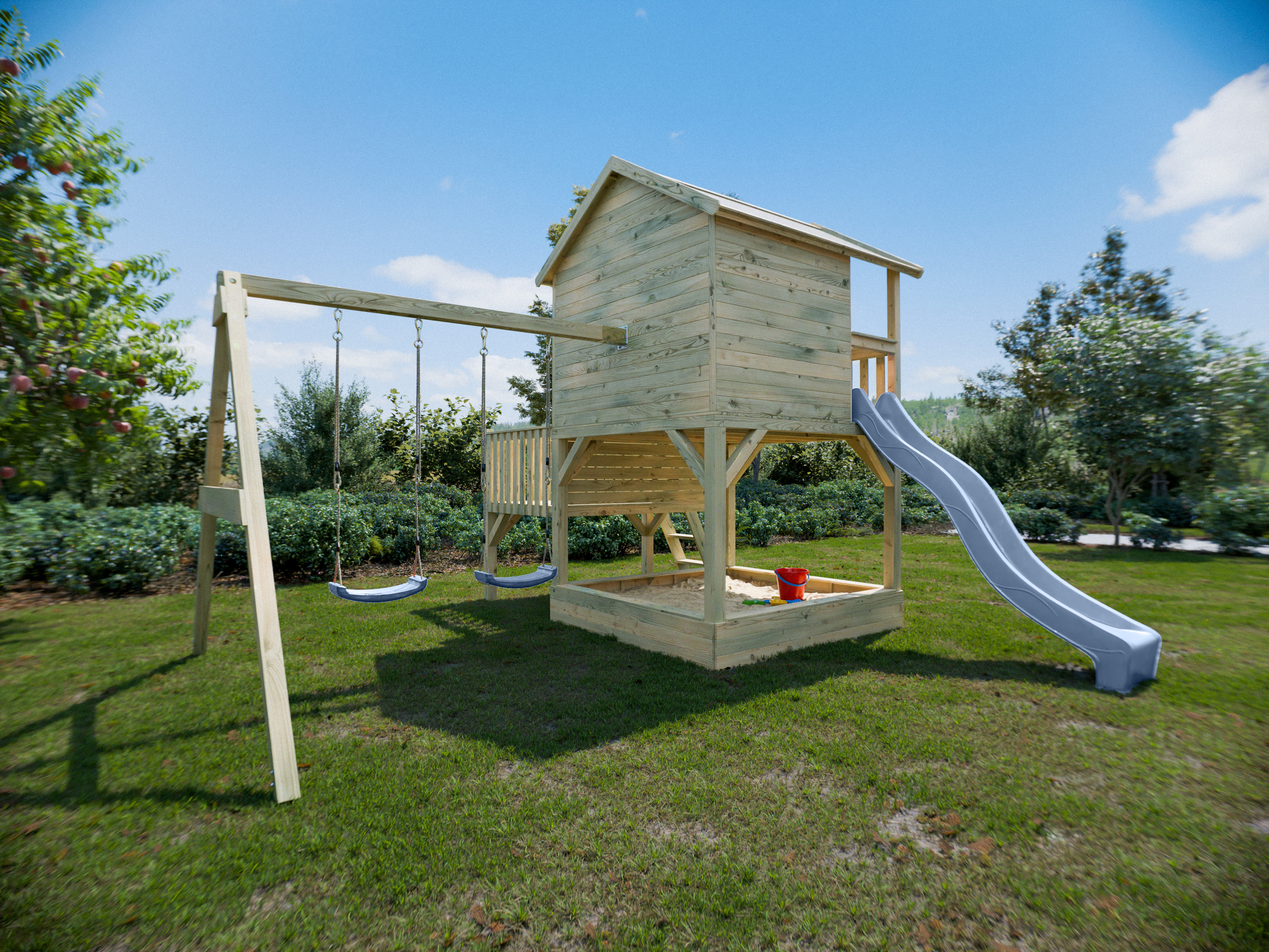 Das Stelzenhaus wird mit Doppelschaukelanbau (7 x 7 cm starke Pfosten, 9 x 9 cm starker Querbalken) inklusive zwei Schaukelsitzen geliefert. Bitte beachte, dass der Schaukelanbau nur wie abgebildet auf der Rückseite des Stelzenhauses montiert werden kann. An der Seitenwand mit offenem Fensterausschnitt ist dies aus Sicherheitsgründen nicht möglich. - Kesseldruckimprägnierung für lange Haltbarkeit