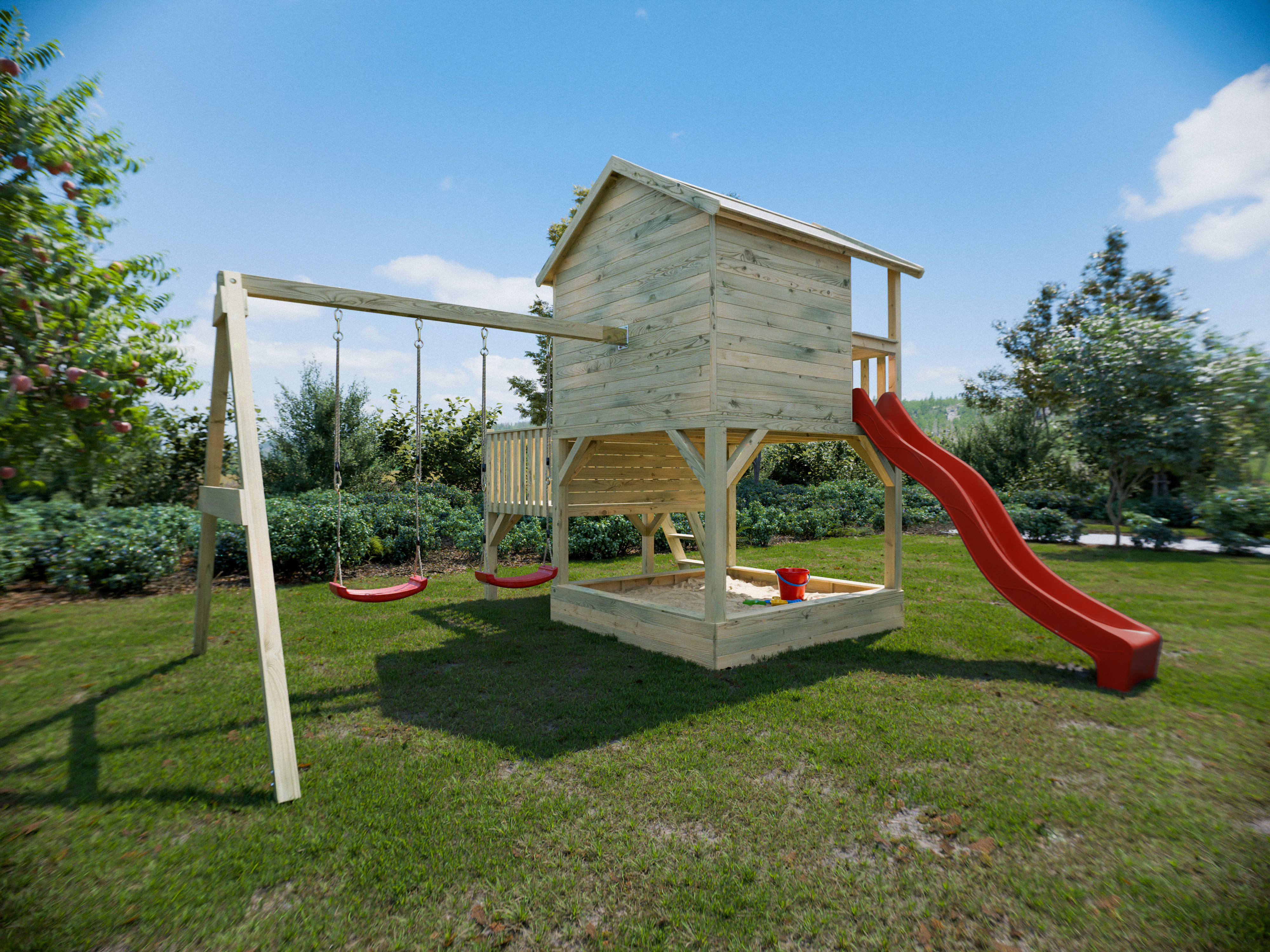 Das Stelzenhaus wird mit Doppelschaukelanbau (7 x 7 cm starke Pfosten, 9 x 9 cm starker Querbalken) inklusive zwei Schaukelsitzen geliefert. Bitte beachte, dass der Schaukelanbau nur wie abgebildet auf der Rückseite des Stelzenhauses montiert werden kann. An der Seitenwand mit offenem Fensterausschnitt ist dies aus Sicherheitsgründen nicht möglich. - Kesseldruckimprägnierung für lange Haltbarkeit
