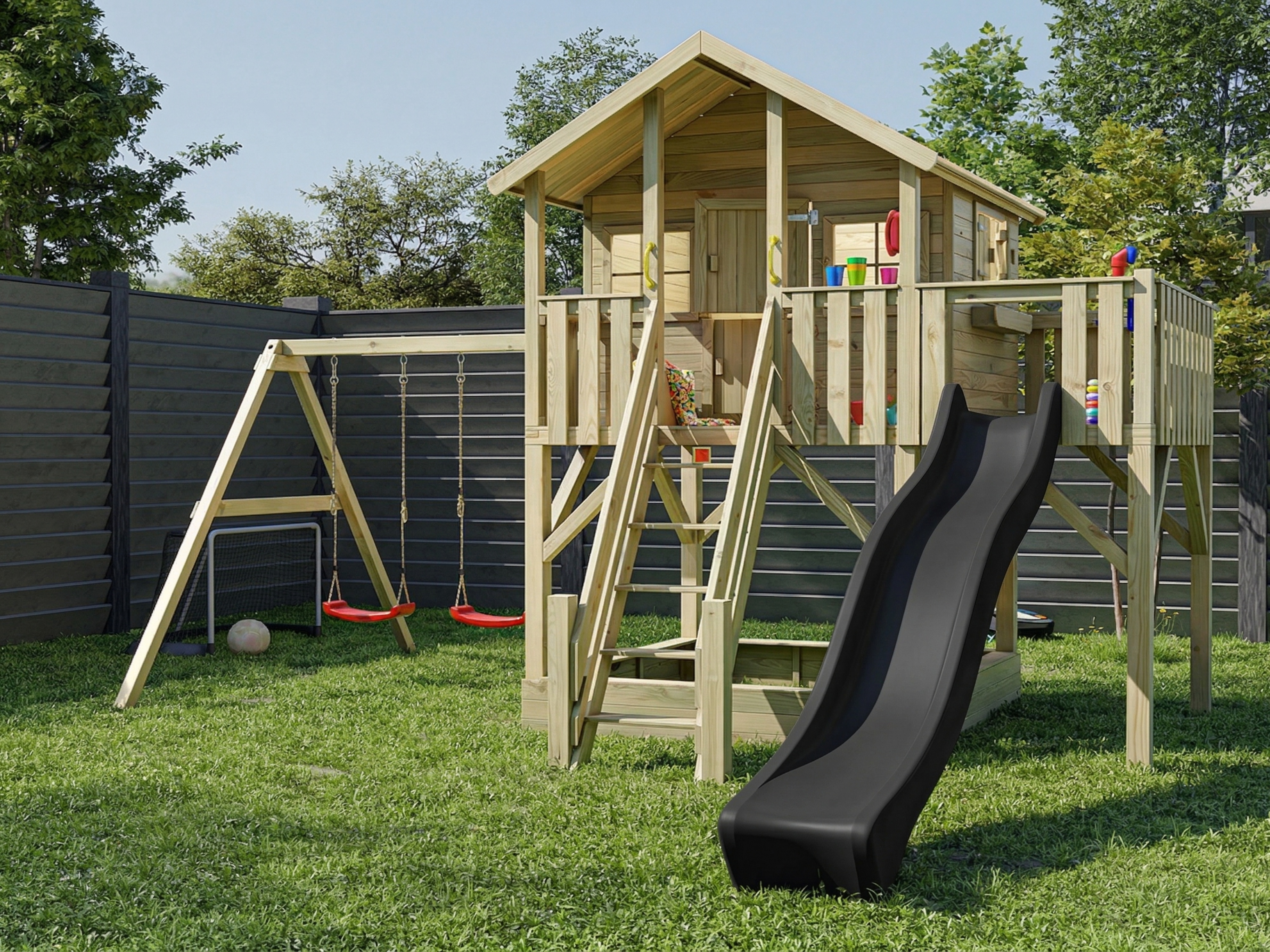 Prestige Garden Stelzenhaus "Big House XL" kesseldruckimprägniert inkl. Doppelschaukel und Rutsche grau