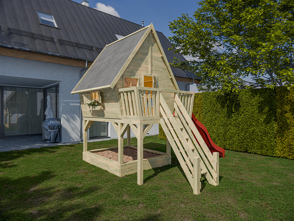 Unter dem Stelzenhaus befindet sich ein großer Sandkasten inkl. vier Sitzbrettern. - Inkl. 140 cm Podest und Rutsche