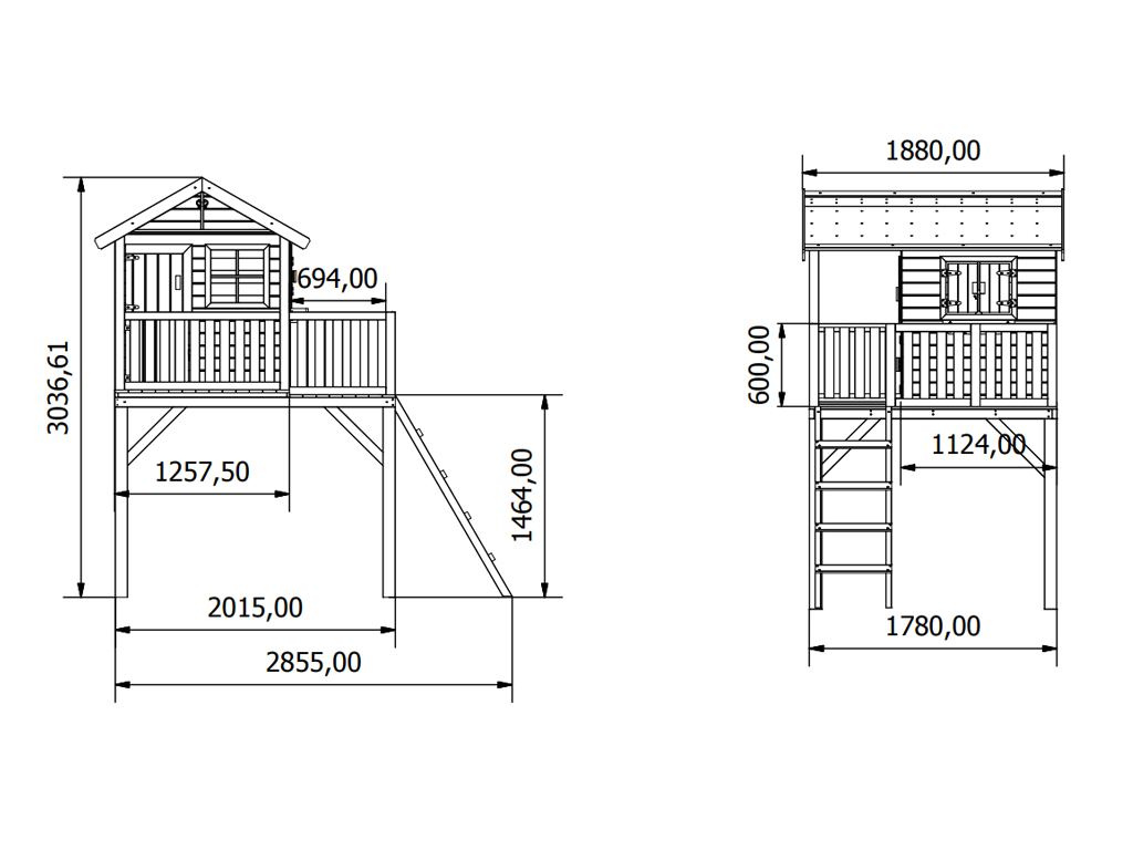 | Lieferumfang: | Stelzenhaus Funny XXL, Blumenkasten, Fensterläden, Veranda, Balkon, detaillierte Montageanleitung |