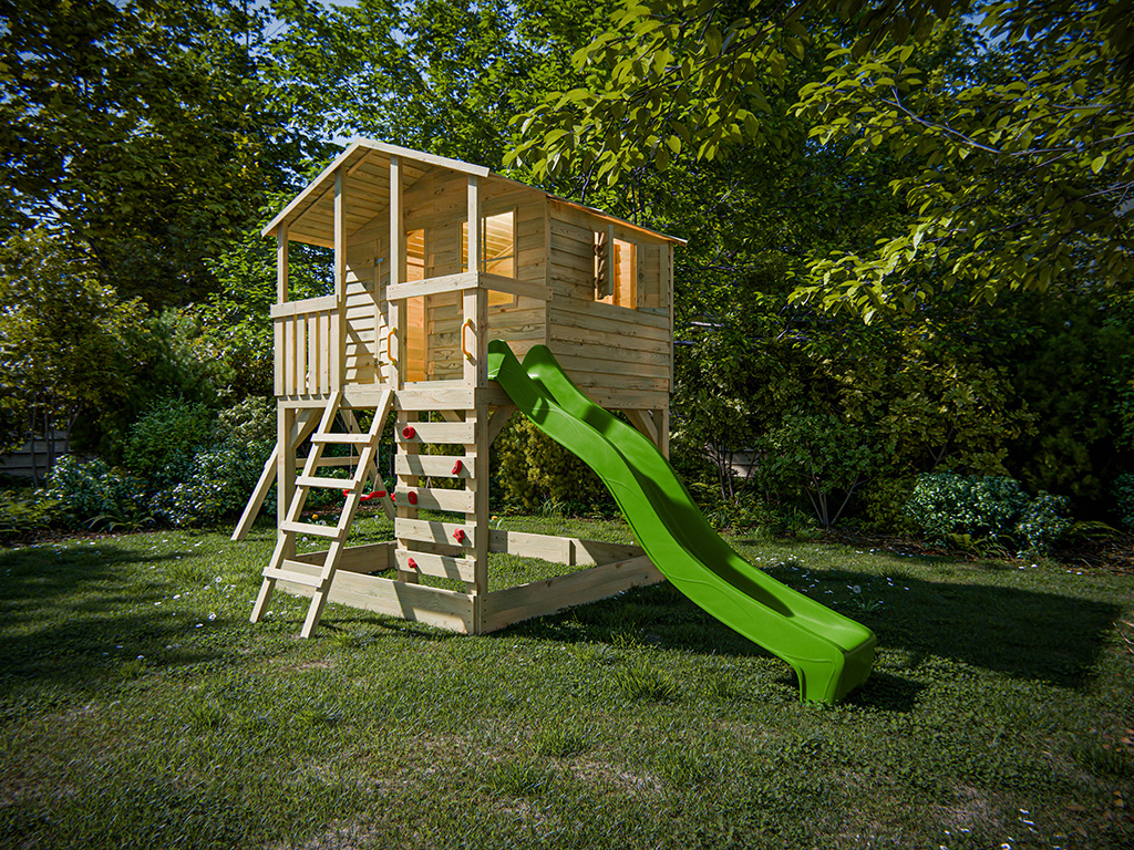 Im Lieferumfang ist eine schräge Leiter für einen sicheren Aufstieg enthalten. Für zusätzlichen Spielspaß ist das Stelzenhaus mit einer Kletterwand und 5 roten Klettersteinen ausgestattet. - Inkl. Doppelschaukel und Rutsche