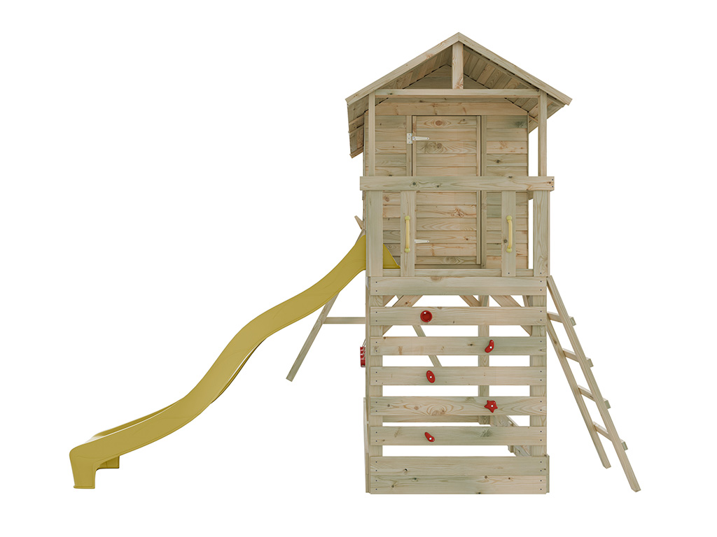 Im Lieferumfang ist eine schräge Leiter für einen sicheren Aufstieg enthalten. Für zusätzlichen Spielspaß ist das Stelzenhaus mit einer Kletterwand und 5 roten Klettersteinen ausgestattet. - Inkl. Doppelschaukel und Rutsche