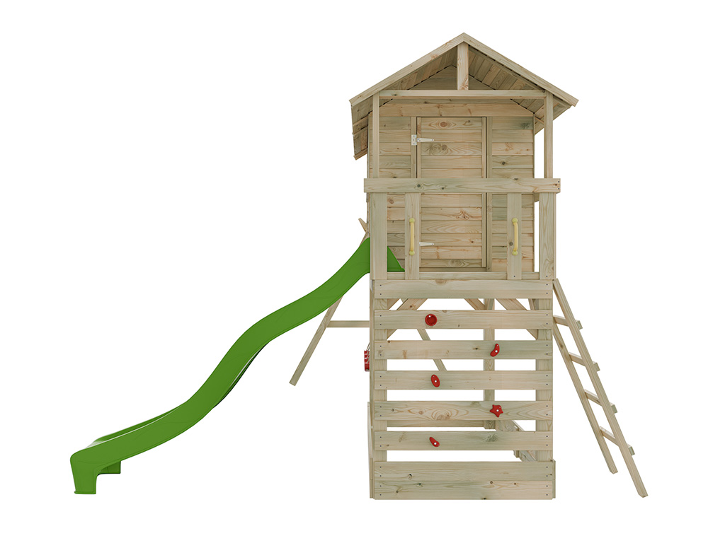Im Lieferumfang ist eine schräge Leiter für einen sicheren Aufstieg enthalten. Für zusätzlichen Spielspaß ist das Stelzenhaus mit einer Kletterwand und 5 roten Klettersteinen ausgestattet. - Inkl. Doppelschaukel und Rutsche