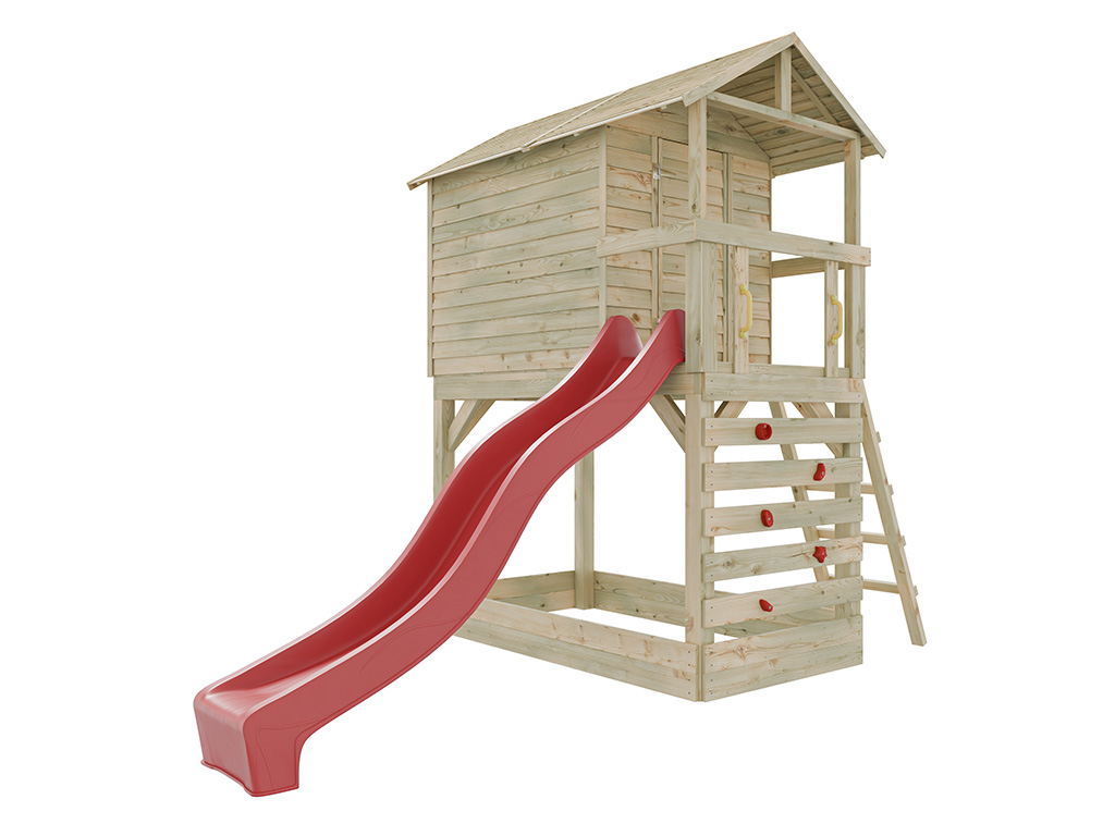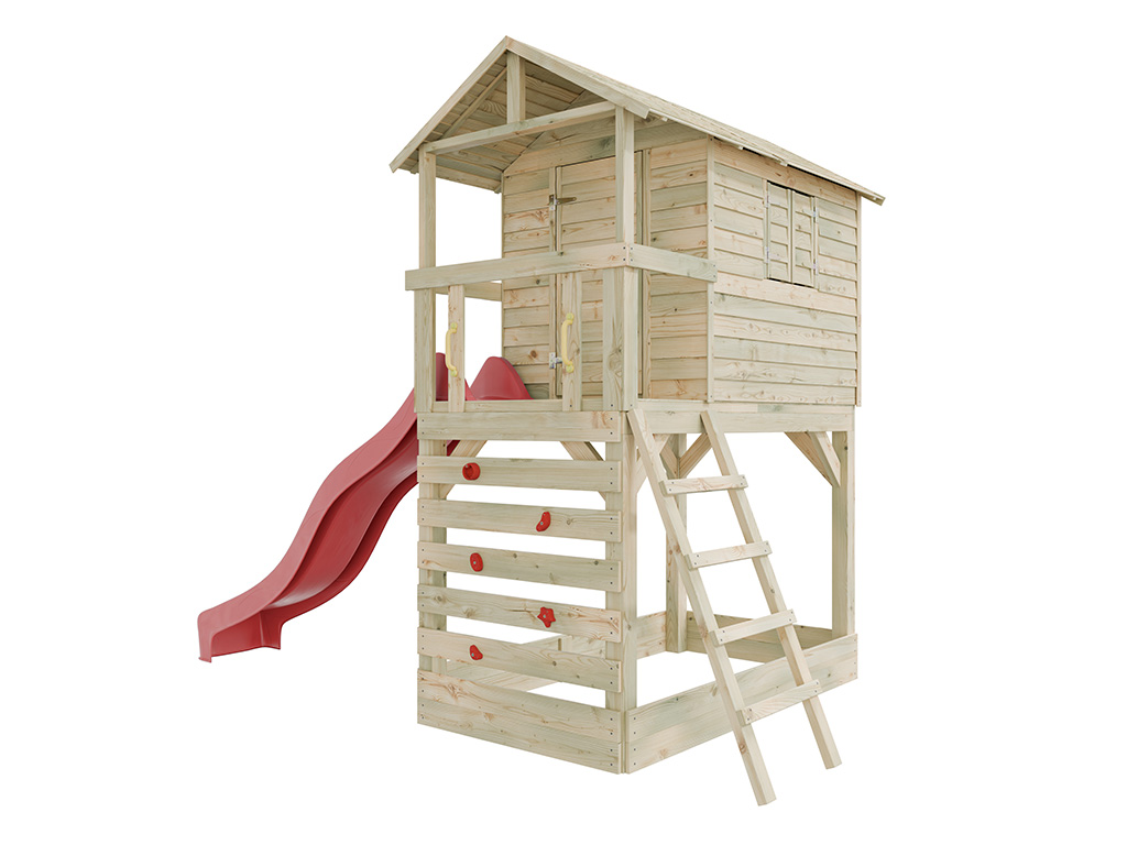 Im Lieferumfang ist eine schräge Leiter für einen sicheren Aufstieg enthalten. Für zusätzlichen Spielspaß ist das Stelzenhaus mit einer Kletterwand und 5 roten Klettersteinen ausgestattet. - Inkl. Rutsche