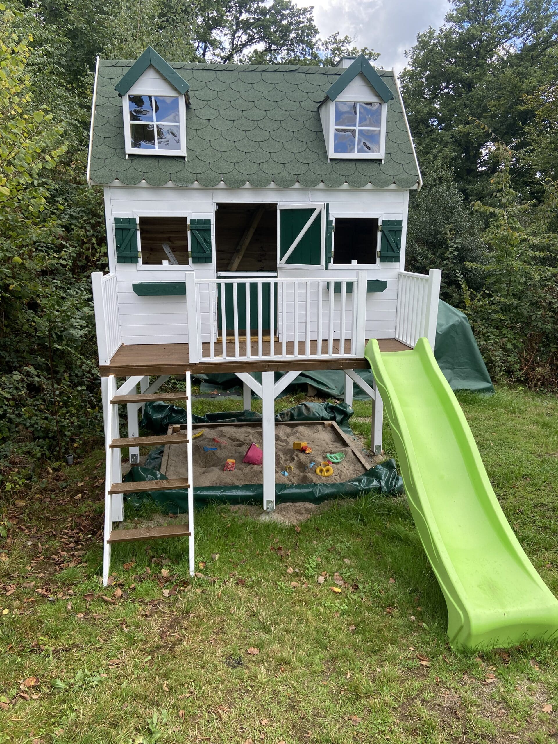 Das Haus selber hat mich von der Qualität etwas enttäuscht, durch die Elementbauweise kam es leider zu Lücken, die Dachlatten sind meiner Meinung zu dünn so das es bei mir etwas durchhing und die Giebelfenster passten auch nicht ganz wie es soll. Das alles trübt aber nicht den Spaß, den die Kinder darin haben, vor allem der Schlafboden ist bei den Kindern sehr beliebt.