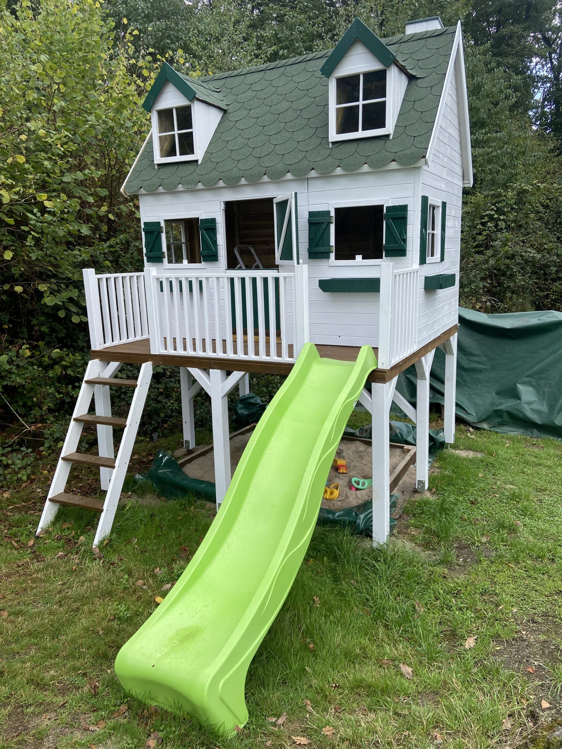 Das Haus selber hat mich von der Qualität etwas enttäuscht, durch die Elementbauweise kam es leider zu Lücken, die Dachlatten sind meiner Meinung zu dünn so das es bei mir etwas durchhing und die Giebelfenster passten auch nicht ganz wie es soll. Das alles trübt aber nicht den Spaß, den die Kinder darin haben, vor allem der Schlafboden ist bei den Kindern sehr beliebt.