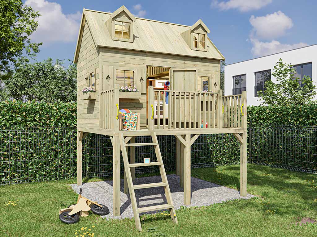 Das Stelzenhaus mit 120 cm Podest und Schlafboden sorgt für großes Spielvergnügen bei den Kindern.