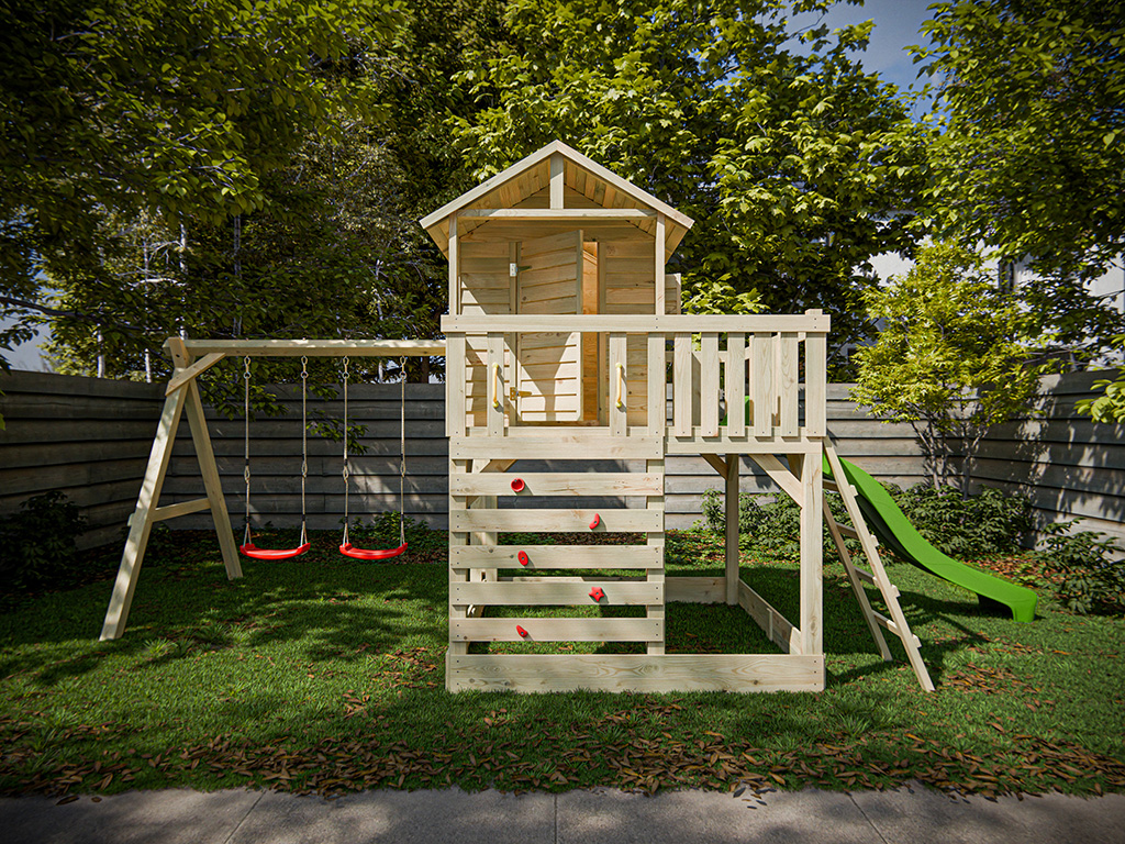 Dieses Set beinhaltet zusätzlich zum Stelzenhaus einen Doppelschaukelanbau mit zwei roten Schaukelsitzen aus Kunststoff und eine Wellenrutsche. Bitte beachte, dass sich der Schaukelanbau nur an einem der hinteren Pfosten montieren und seitlich nur an der Seite, an der keine Rutsche montiert wird. Die Rutsche lässt sich mit wenigen Handgriffen in eine Wasserrutsche verwandeln. Hierfür befindet sich an der Unterseite der Rutsche ein Anschluss für den Gartenschlauch, der einmalig mit einem Bohrloch hergestellt werden kann.inmalig mit einem Bohrloch hergestellt werden kann. - Einfacher Aufbau