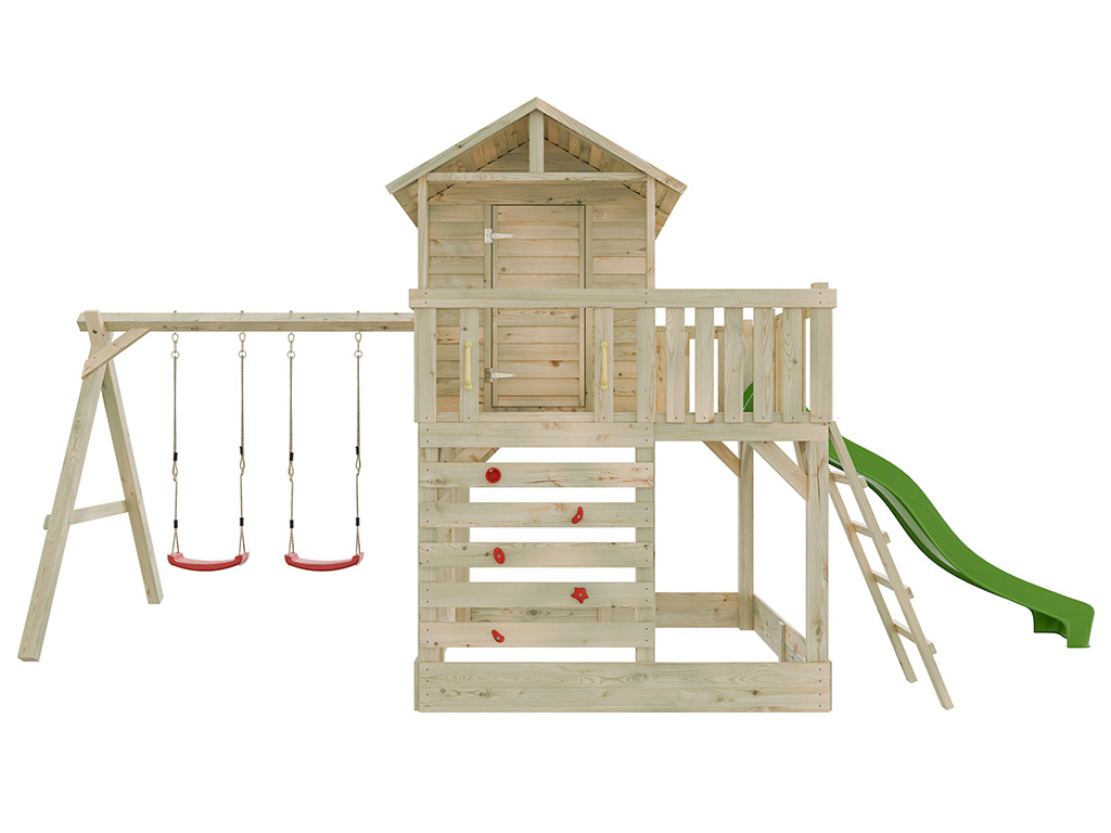 Im Lieferumfang ist eine schräge Leiter für einen sicheren Aufstieg enthalten. Für zusätzlichen Spielspaß ist das Stelzenhaus mit einer Kletterwand und 5 roten Klettersteinen ausgestattet. - Inkl. Doppelschaukel und Rutsche