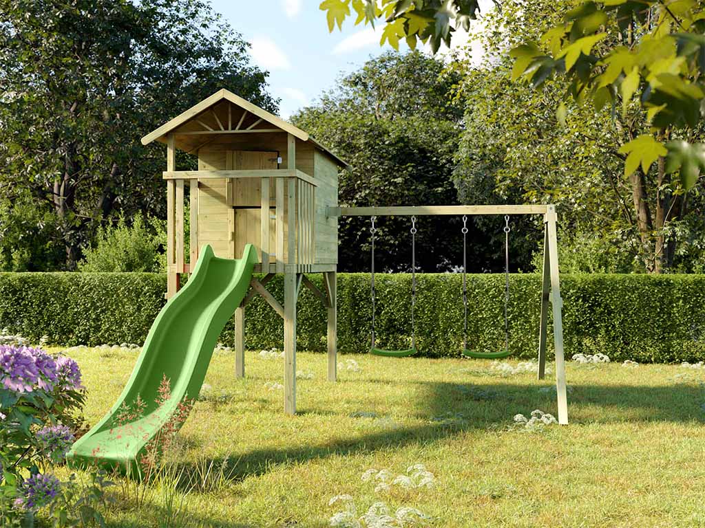 | Lieferumfang: | Stelzenhaus Tree Hut, Doppelschaukel, Rutsche grün |