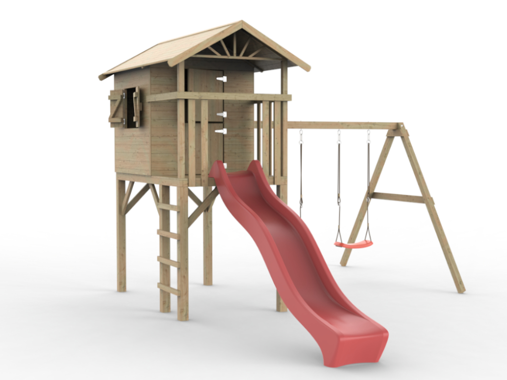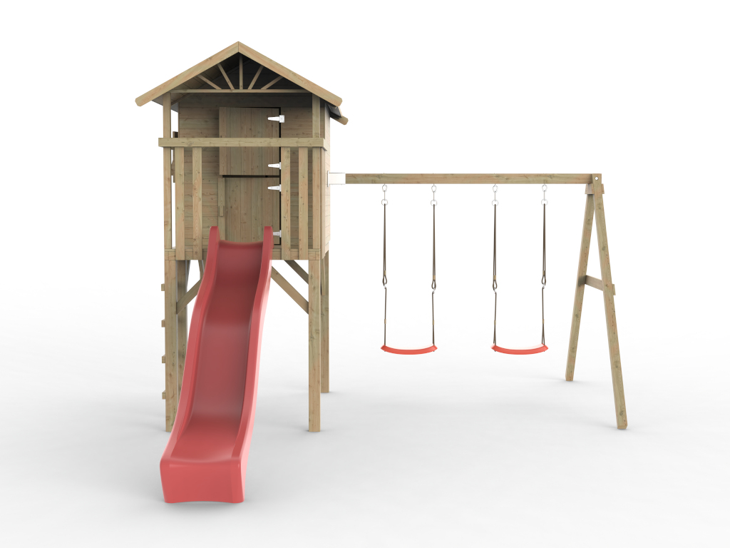 | Lieferumfang: | Stelzenhaus Tree Hut, Doppelschaukel, Rutsche rot |