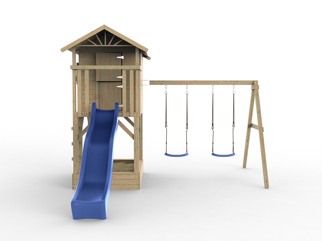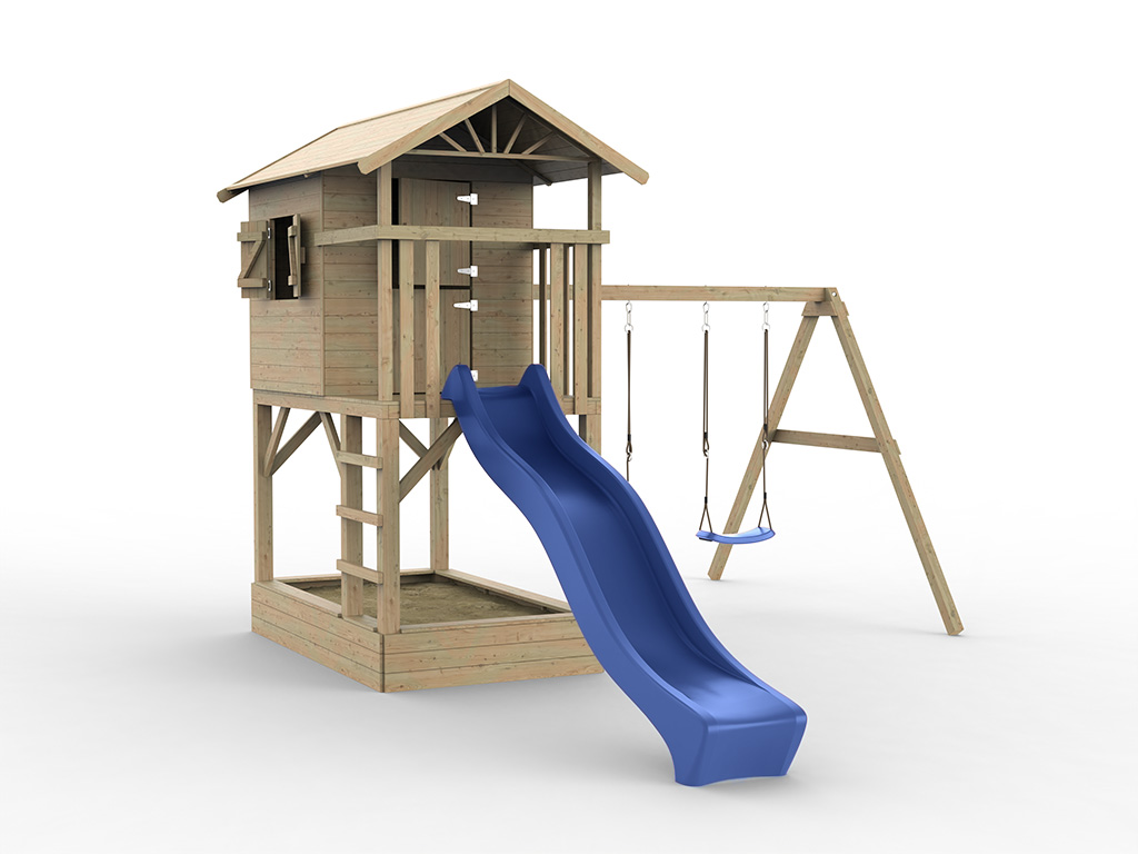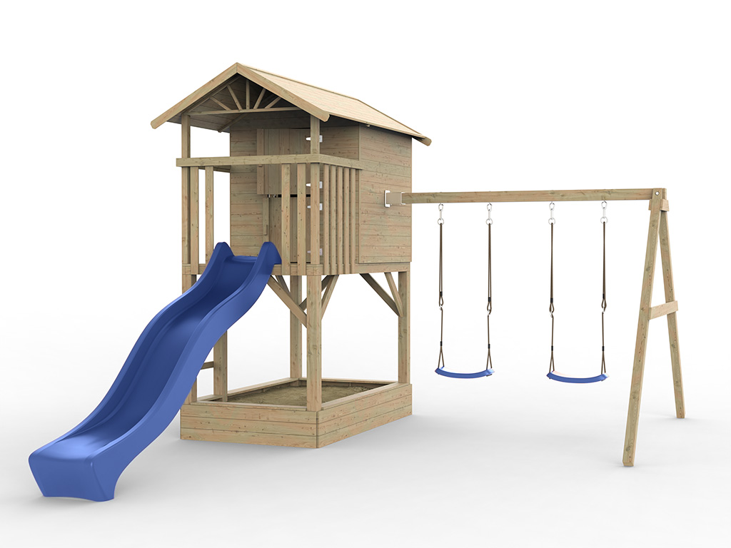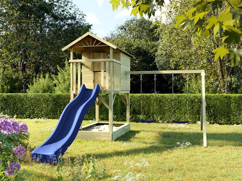| Lieferumfang: | Stelzenhaus Tree Hut, Sandkasten, Doppelschaukel, Rutsche blau |