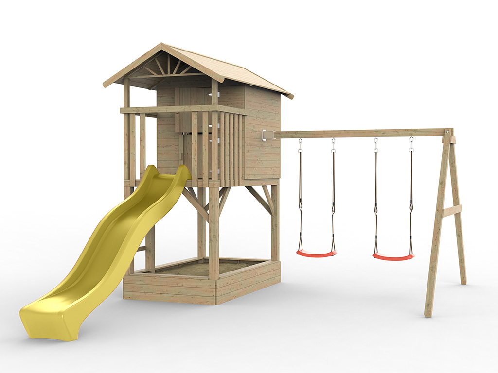 | Lieferumfang: | Stelzenhaus Tree Hut, Sandkasten, Doppelschaukel, Rutsche gelb |