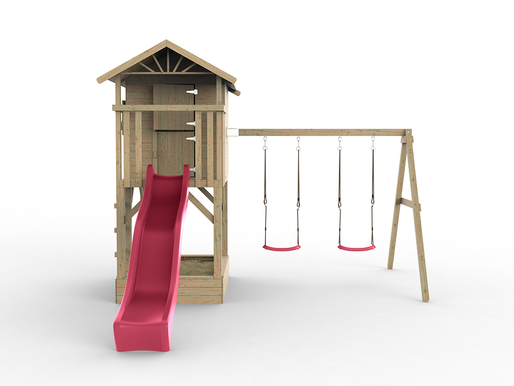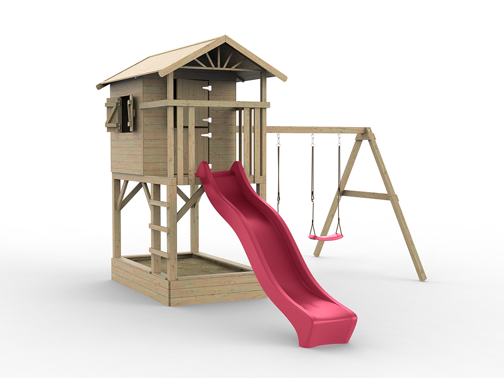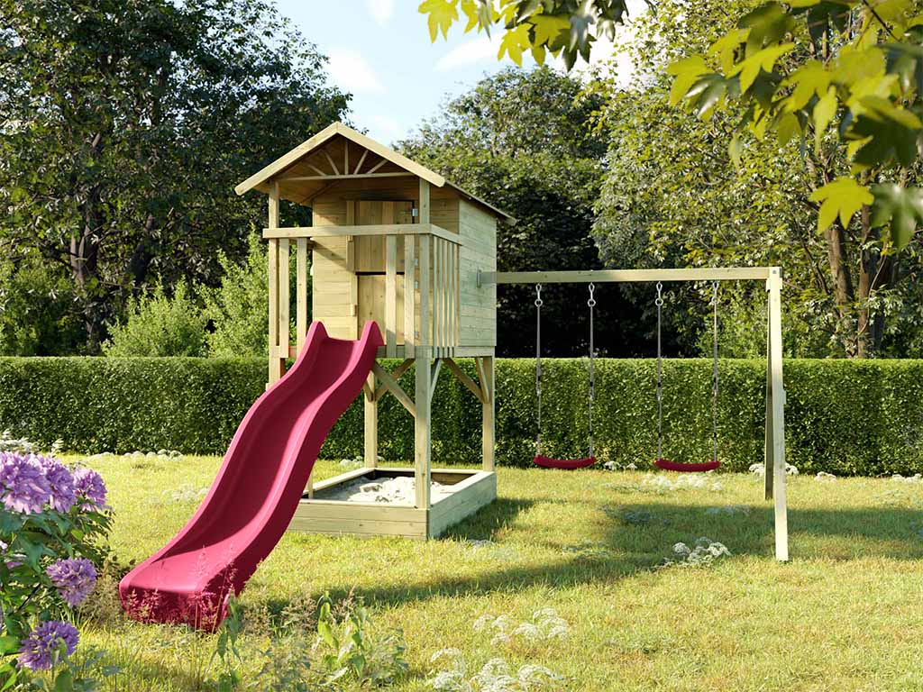 | Lieferumfang: | Stelzenhaus Tree Hut, Sandkasten, Doppelschaukel, Rutsche pink |