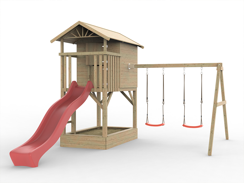 | Lieferumfang: | Stelzenhaus Tree Hut, Sandkasten, Doppelschaukel, Rutsche rot |