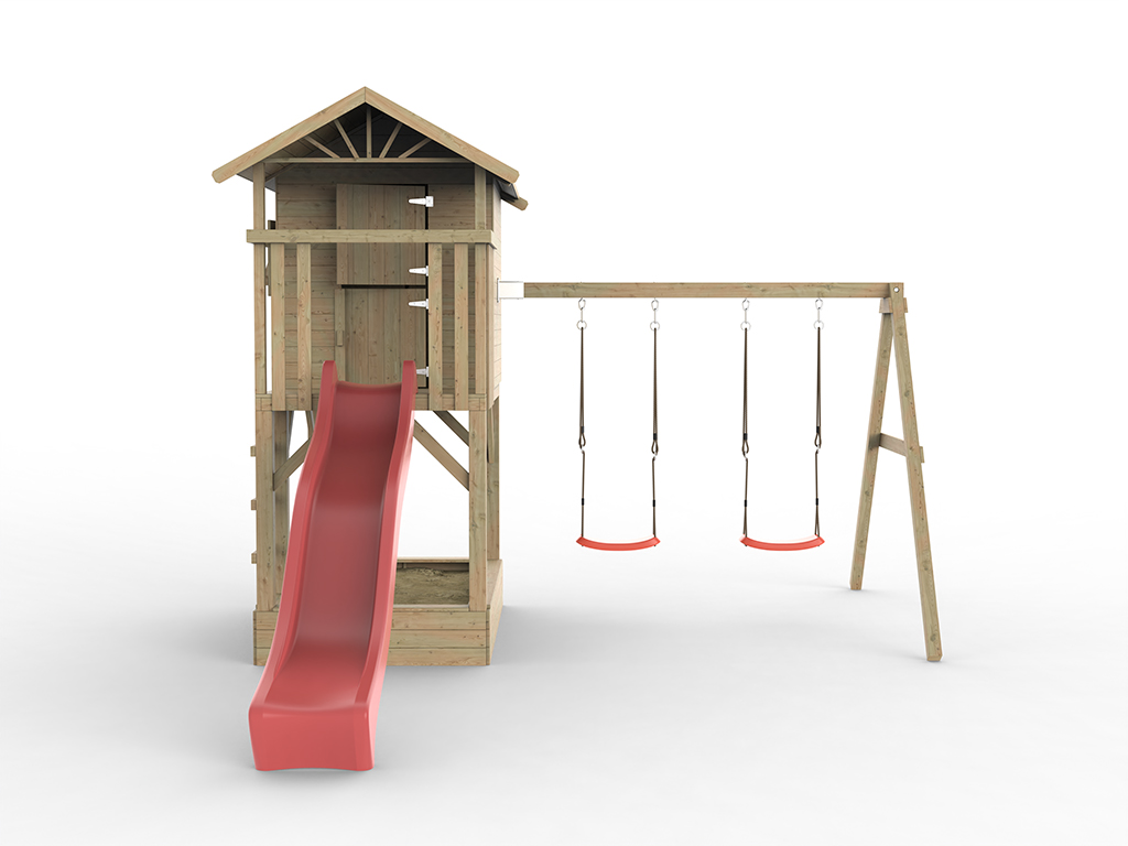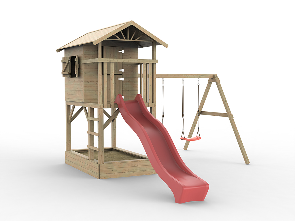 • Stelzenhaus Tree Hut, Sandkasten, Doppelschaukel, Rutsche rot