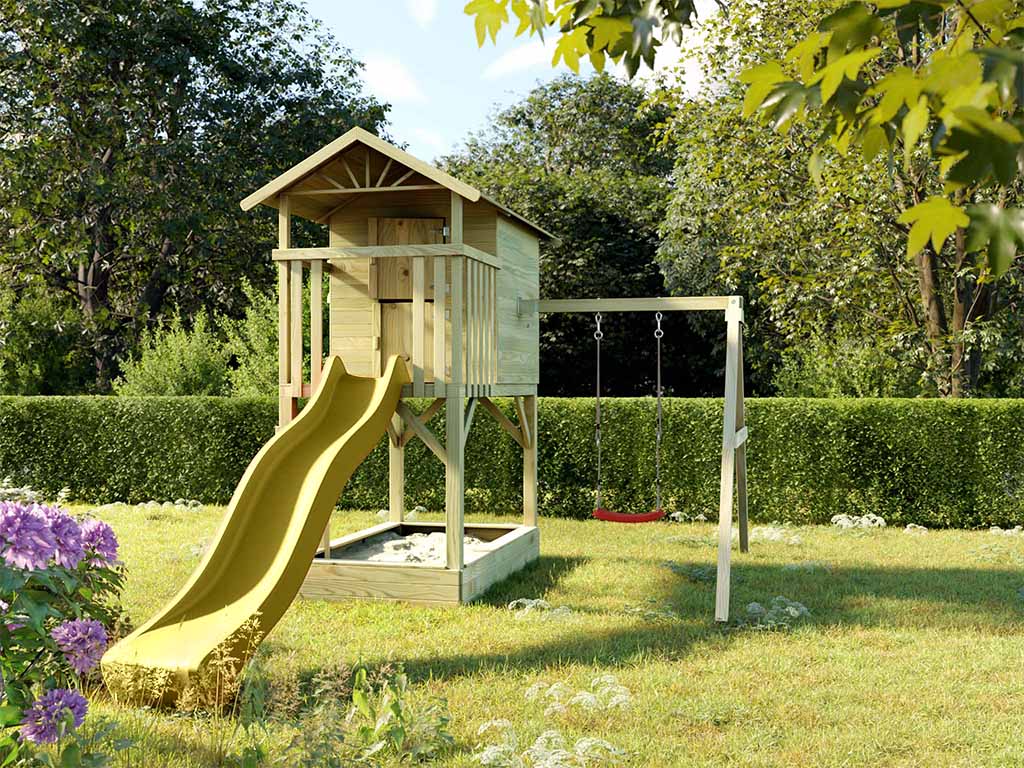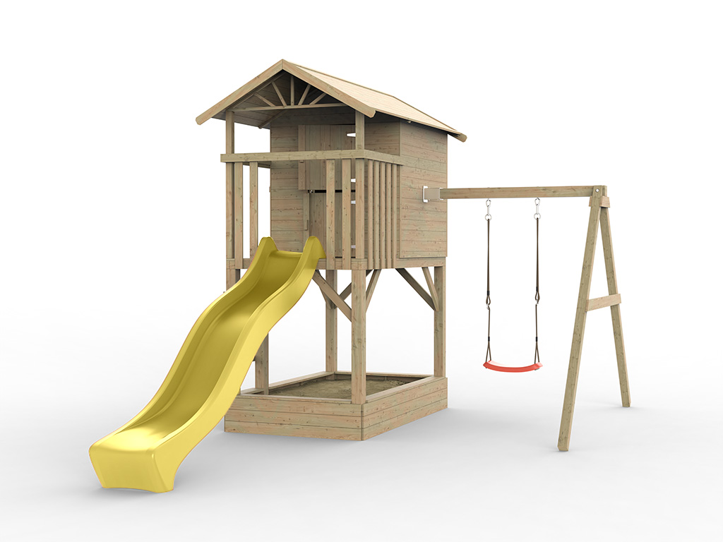 Prestige Garden Stelzenhaus "Tree Hut mit Sandkasten" kesseldruckimprägniert inkl. Einzelschaukelanbau und Wellenrutsche gelb