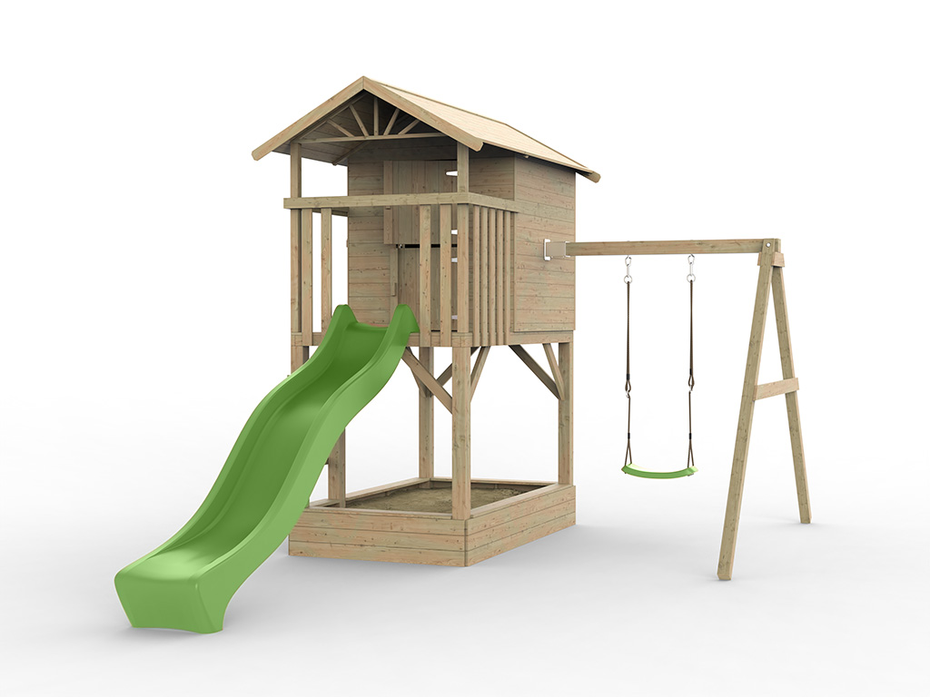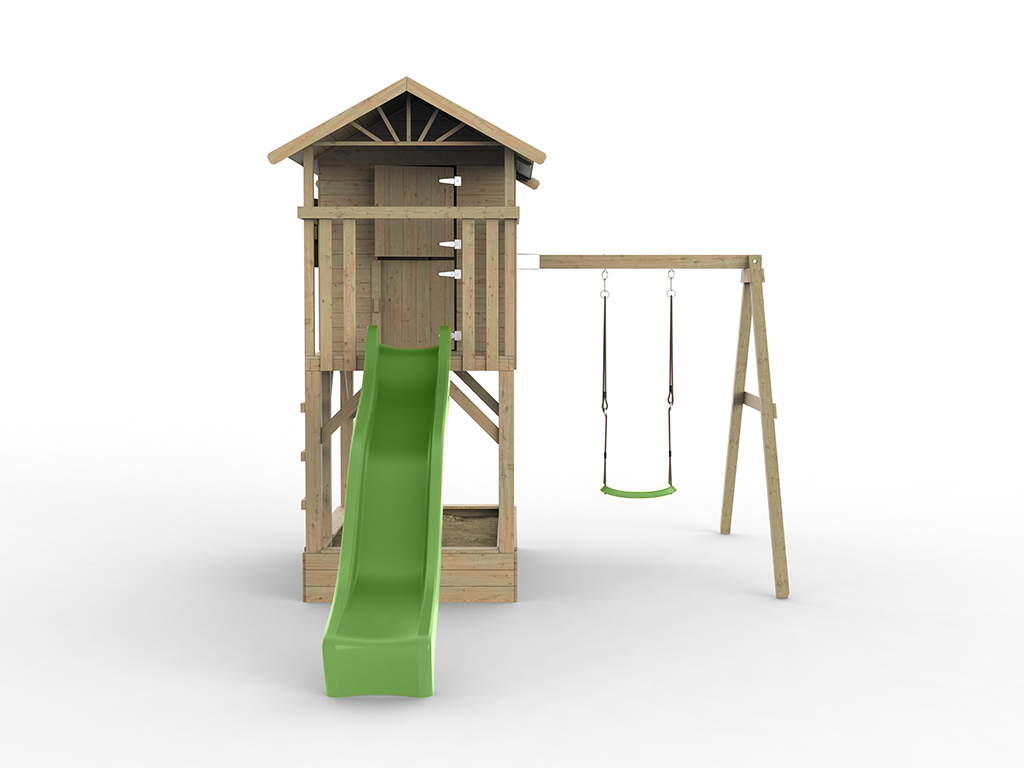 Das Spielhaus wird mit Einzelschaukelanbau inklusive einem grünen Schaukelsitz geliefert. - Stabile Grundkonstruktion