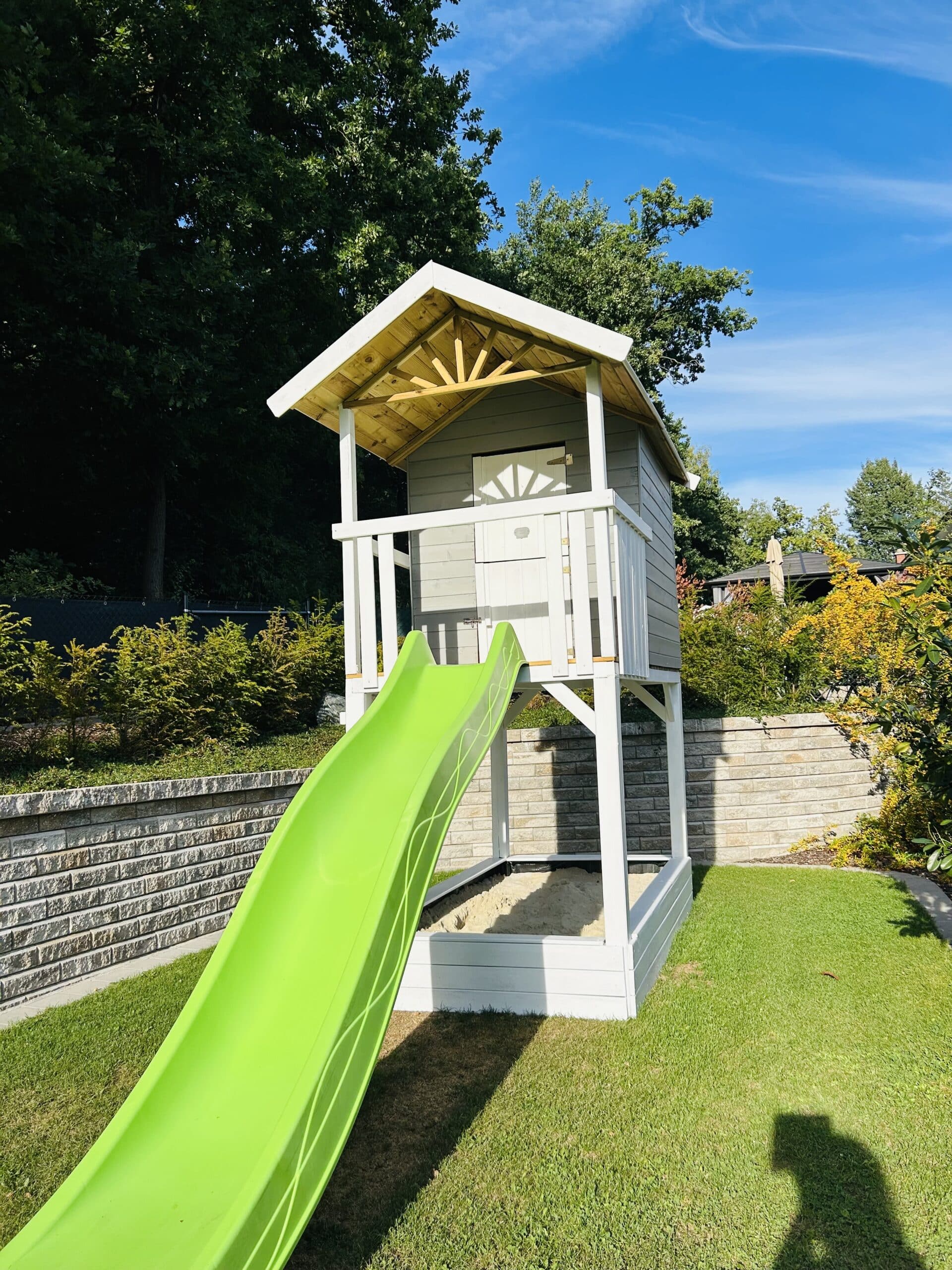 Das Stelzenhaus wird mit Einzeltür, Fenster, Sandkasten, Leiter und Handgriff geliefert und sorgt für großes Spielvergnügen bei den Kindern.