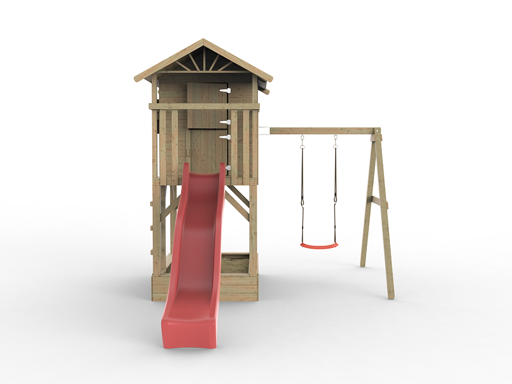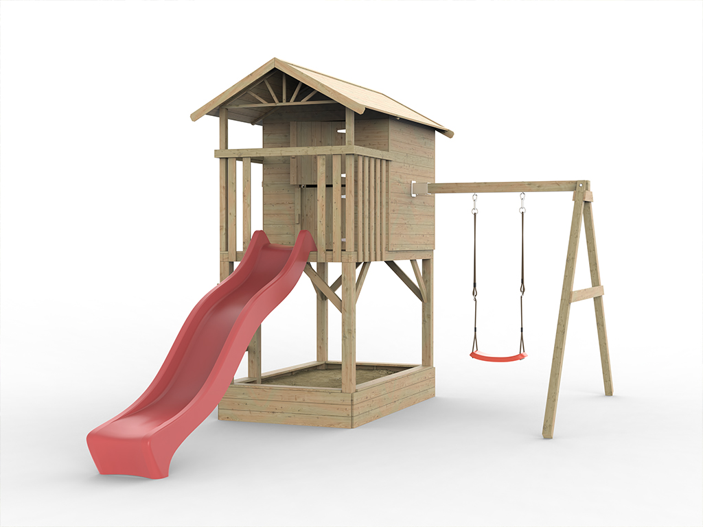 Das Spielhaus wird mit Einzelschaukelanbau inklusive einem roten Schaukelsitz geliefert. - Stabile Grundkonstruktion
