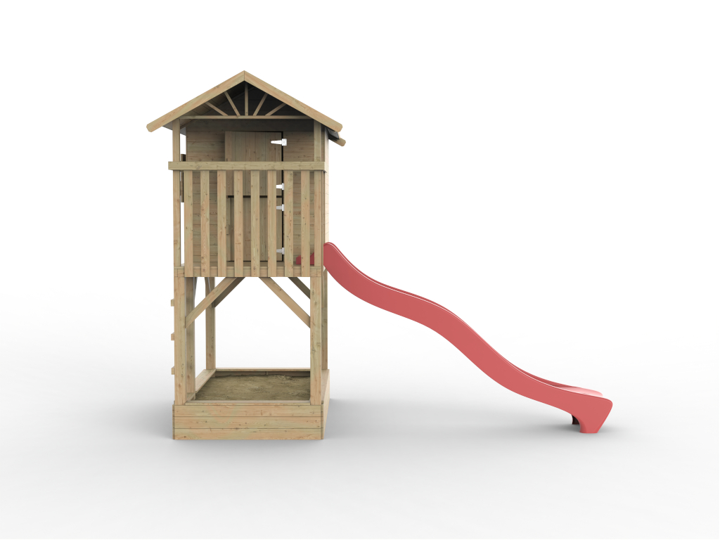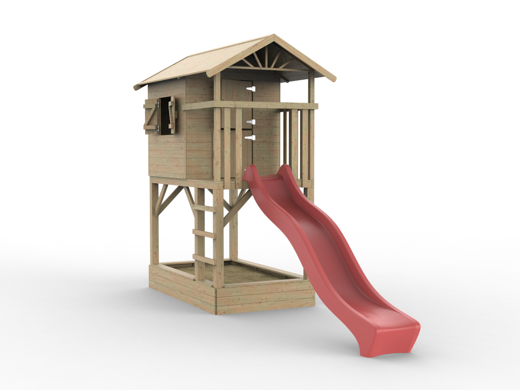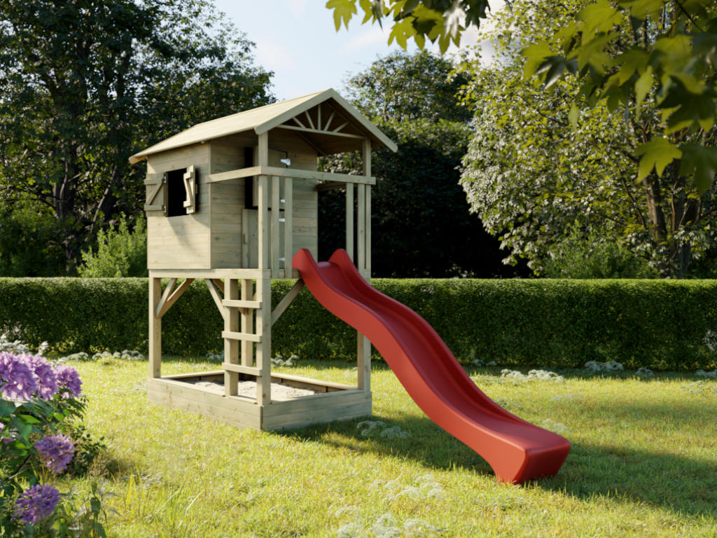 Das Spielhaus wird mit Einzeltür, Fenster, Leiter, Sandkasten und Handgriff geliefert und sorgt für großes Spielvergnügen bei den Kindern.
