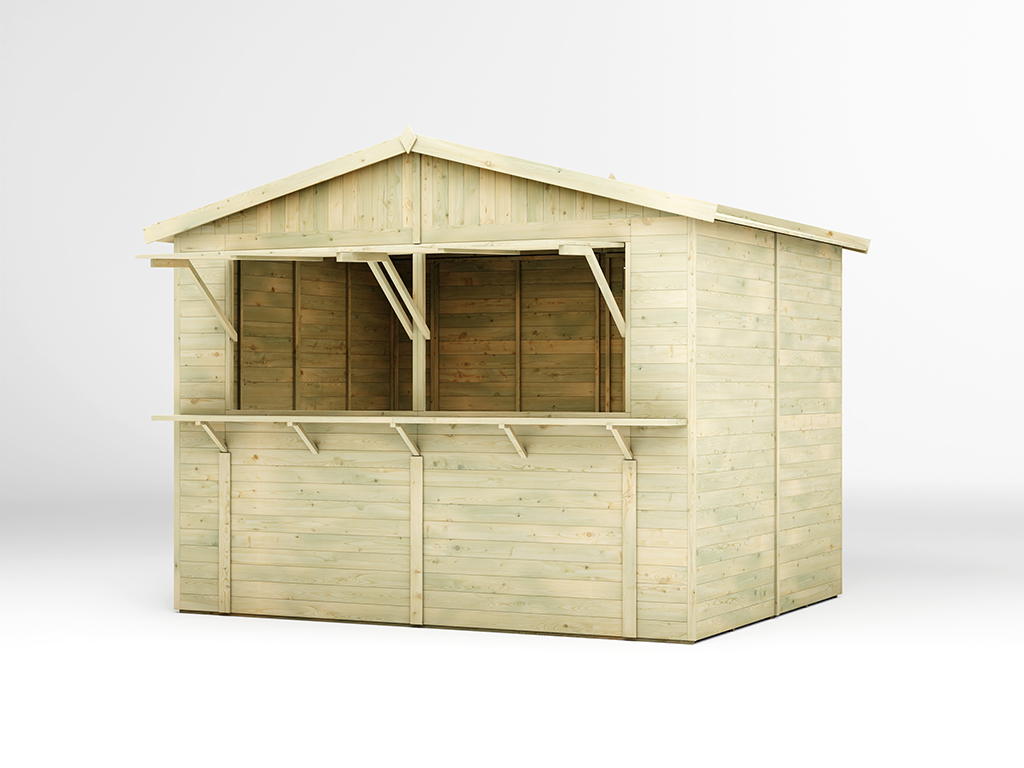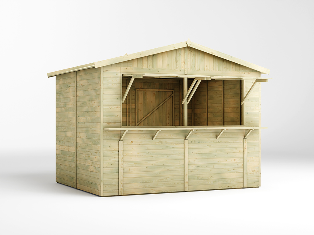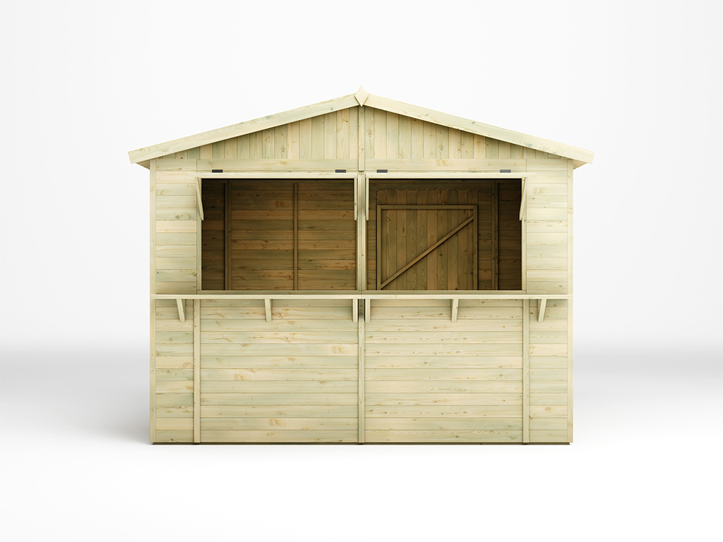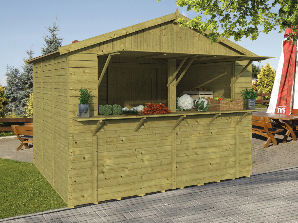 Der 7,5 m² große Marktstand mit einem Wandaußenmaß ohne Dachüberstände von 308 x 243 cm ist mit einem zweigeteilten Verkaufsfenster (je 104 x 116 cm) ausgestattet, das sich von innen mit einem Riegel verschließen lässt. - Inkl. abschließbarer Tür in der Rückwand