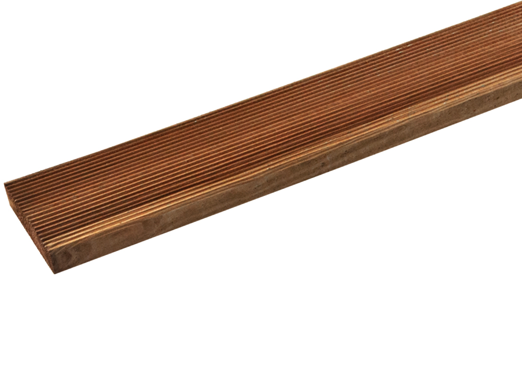 Diese 27 mm starken Terrassendielen werden aus Kiefer hergestellt. Das Kiefernholz zeichnet sich durch eine gleichmäßige und gerade Faserstruktur sowie sehr gute und leichte Verarbeitung aus. Der hohe Harzanteil vom Kiefernholz schützt das Kernholz vor parasitärem Befall und Witterungseinflüssen. Das mäßig dauerhafte Kiefernholz ist mit seiner mittleren Rohdichte und mittlerem Gewicht den Dauerhaftigkeitsklassen 3–4 zuzuordnen. Im Außenbereich verwendet, sollte das mäßig dauerhafte Kiefernholz am besten mit Holzschutzmitteln verstärkt werden. Kiefernholz eignet sich besonders gut für eine Kesseldruckimprägnierung, die das Holz widerstandfähiger und haltbarer macht. Danach hält das Holz gut 10 Jahre.