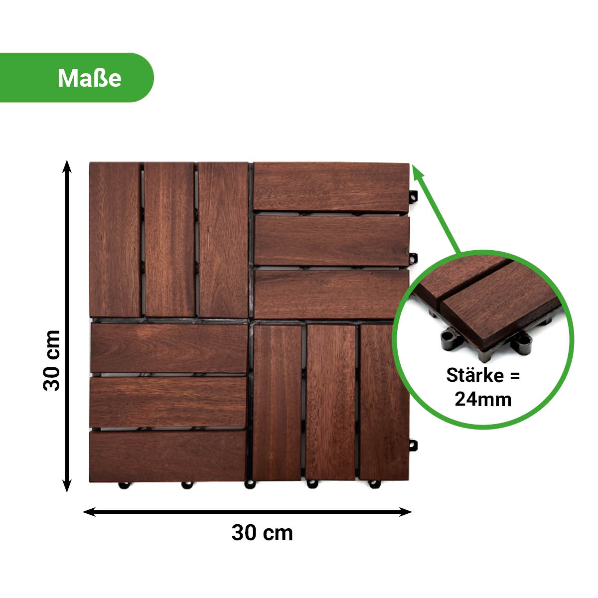 Diese 24 mm starken Terrassenfliesen werden aus Akazie hergestellt. Das gold- bis olivbraune Hartholz der Akazie besticht mit seiner glatten Oberfläche und der lebhaften Maserung durch ausgeprägte Jahresringe und Streifenzeichnung sowie mit robusten und wetterfesten Eigenschaften. Es ist sehr biegsam und verfügt nur über geringeres Quell- und Schwindverhalten, sodass es kaum zu Rissbildungen kommt und das Holz leicht zu verarbeiten ist. Eine Behandlung mit Holzschutzmitteln schützt vor Sonneneinstrahlung.
