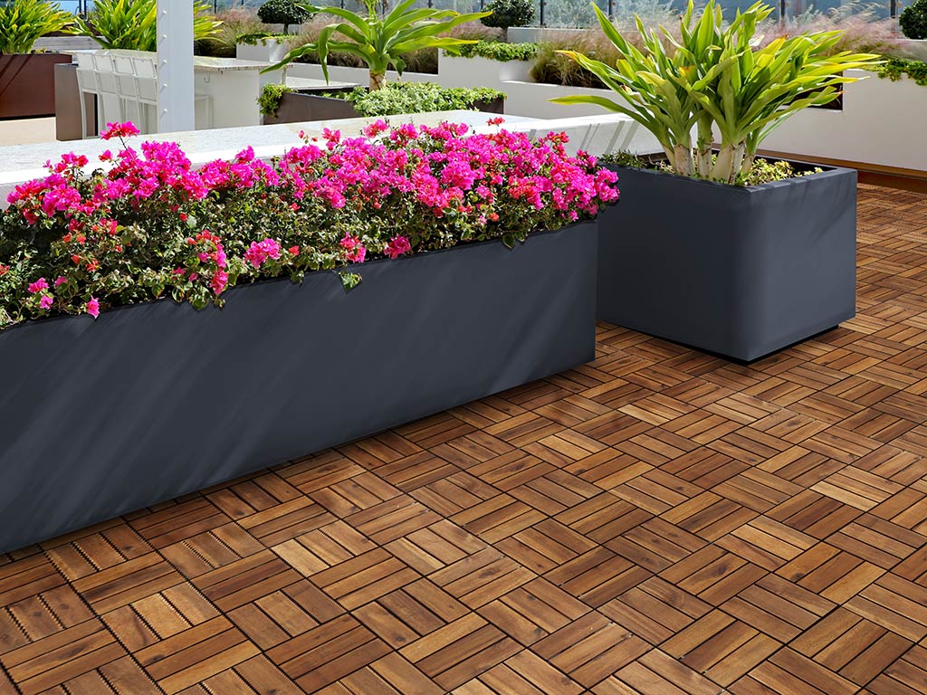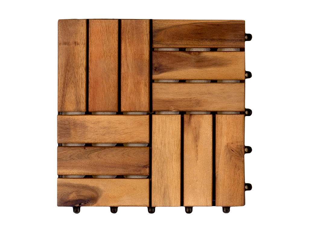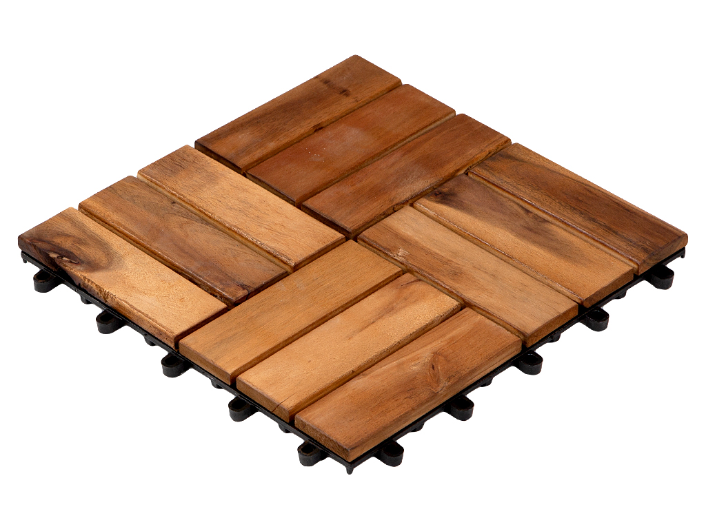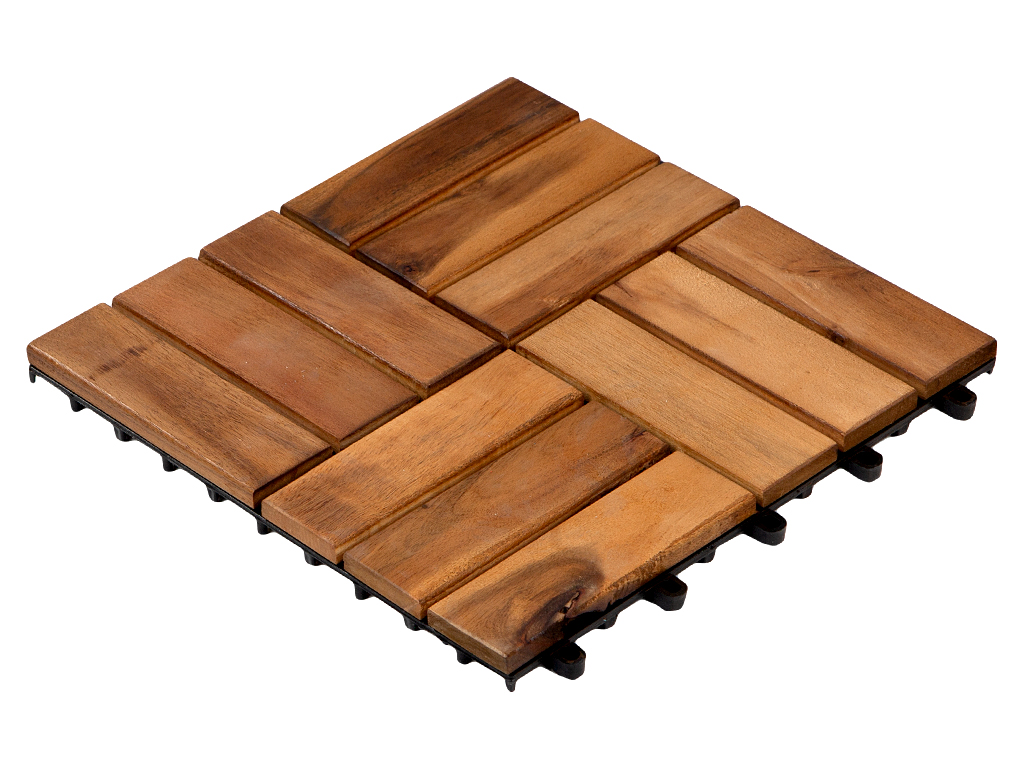 Diese 24 mm starken Terrassenfliesen werden aus Akazie hergestellt. Das gold- bis olivbraune Hartholz der Akazie besticht mit seiner glatten Oberfläche und der lebhaften Maserung durch ausgeprägte Jahresringe und Streifenzeichnung sowie mit robusten und wetterfesten Eigenschaften. Es ist sehr biegsam und verfügt nur über geringeres Quell- und Schwindverhalten, sodass es kaum zu Rissbildungen kommt und das Holz leicht zu verarbeiten ist. Eine Behandlung mit Holzschutzmitteln schützt vor Sonneneinstrahlung.