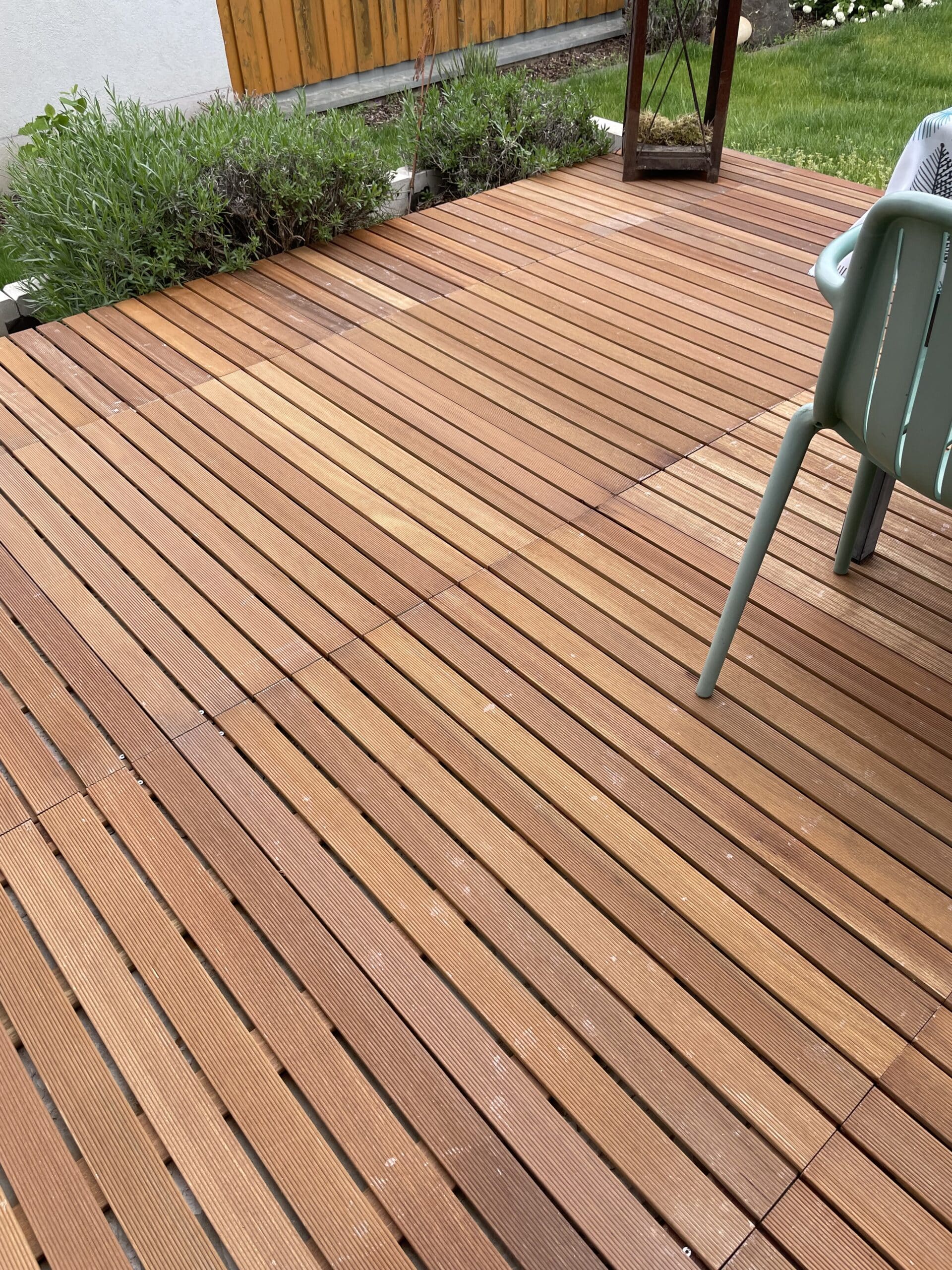 Einfacher Aufbau. Die Dielen lassen sich gut zurecht sägen.