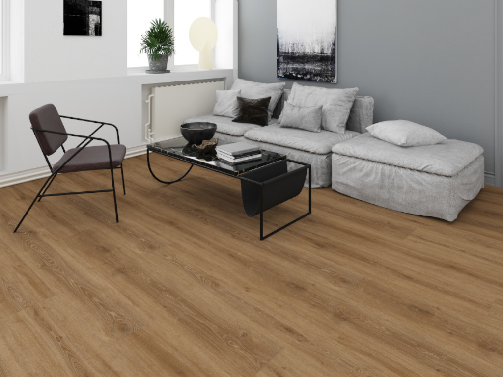 Bei diesem Boden handelt es sich um Rigid Vinyl. Durch den stabilen SPC-Kern, der das Herzstück bildet, hat diese besondere Vinylart zudem eine erhöhte Steifigkeit und Robustheit. Rigid Vinyl ist dadurch besonders formstabil und kann problemlos über vorhandenen Bodenbelag verlegt werden. Dank des SPC-Trägers ist der Boden hitzebeständig und wasserresistent – ideal auch für Feuchträume sowie Wintergärten und Räume mit bodentiefen Fenstern. Durch die 0,55 mm dicke Nutzschicht, die die Oberfläche bedeckt, ist der Bodenbelag besonders langlebig. Außerdem schützt diese Schicht vor Kratzern und Stößen. Für den Gebrauch in Feuchträumen wie Küchen und Bädern ist dieses nässeerprobte Produkt vom Hersteller zugelassen. Über einer Warmwasserfußbodenheizung kann dieser Boden problemlos verlegt werden.