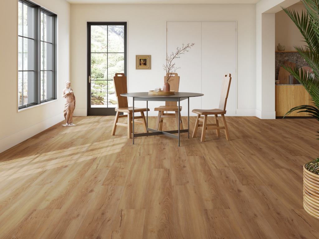 Bei diesem Boden handelt es sich um Rigid Vinyl. Durch den stabilen SPC-Kern, der das Herzstück bildet, hat diese besondere Vinylart zudem eine erhöhte Steifigkeit und Robustheit. Rigid Vinyl ist dadurch besonders formstabil und kann problemlos über vorhandenen Bodenbelag verlegt werden. Dank des SPC-Trägers ist der Boden hitzebeständig und wasserresistent – ideal auch für Feuchträume sowie Wintergärten und Räume mit bodentiefen Fenstern. Durch die 0,2 mm dicke Nutzschicht, die die Oberfläche bedeckt, ist der Bodenbelag besonders langlebig. Außerdem schützt diese Schicht vor Kratzern und Stößen. Dieses Produkt ist mit einer wasserresistenten Trägerplatte ausgestattet und daher perfekt gegen Nässe gefeit. Deshalb kann dieser Bodenbelag problemlos in Feuchträumen wie Küche oder Bad verlegt werden. Der Boden ist unempfindlich gegenüber Temperaturschwankungen und hat eine hohe thermische Leitfähigkeit, weshalb er sich zur Verlegung über einer Warmwasserfußbodenheizung eignet.