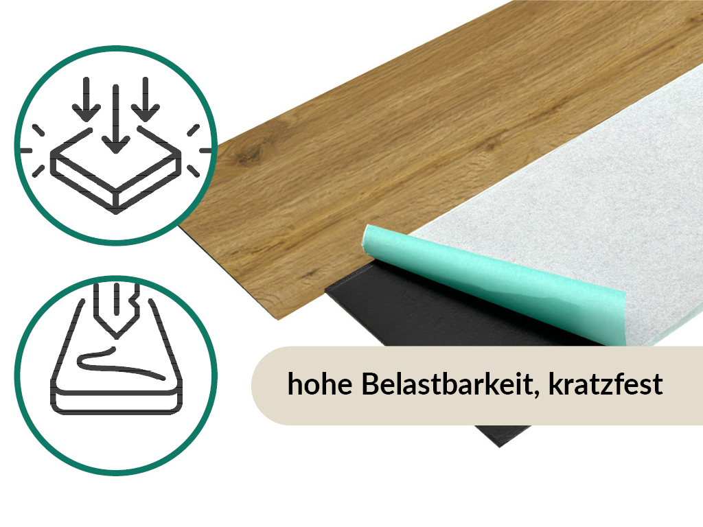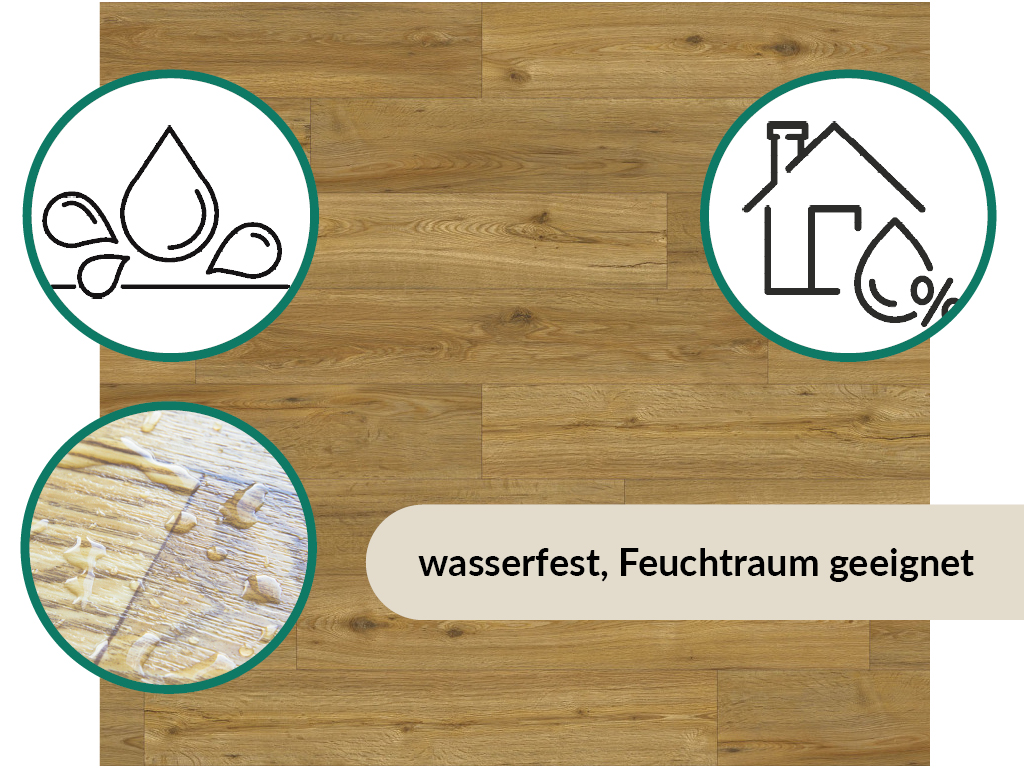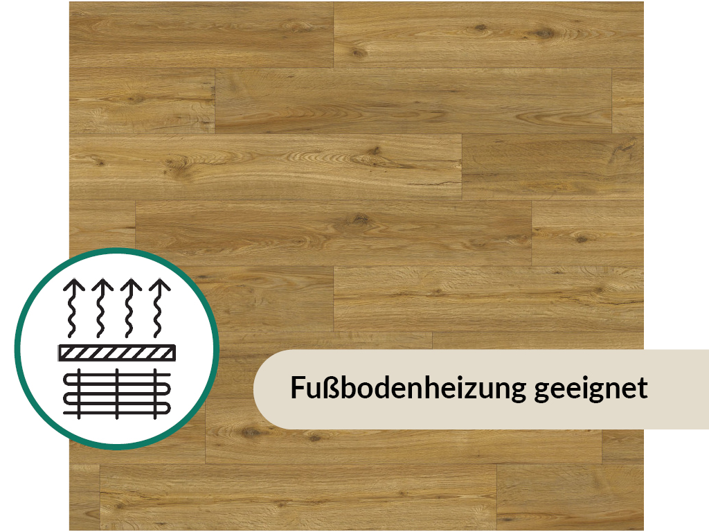 Durch die 0,2 mm dicke Nutzschicht, die die Oberfläche bedeckt, ist der Bodenbelag besonders langlebig. Außerdem schützt diese Schicht vor Kratzern und Stößen. Für den Gebrauch in Feuchträumen wie Küchen und Bädern ist dieses nässeerprobte Produkt vom Hersteller zugelassen. Über einer Warmwasserfußbodenheizung kann dieser Boden problemlos verlegt werden.