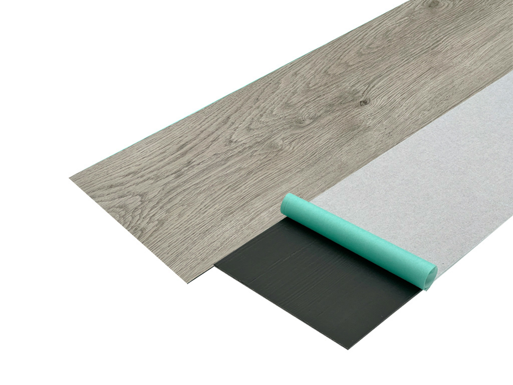 Der Vinylbodenaufbau ist meist fünfschichtig: Die strapazierfähige PU-vergütete Nutzschicht, die mit dem Dekor verpresst ist, darunter der Vinylträger, dann die Trägerplatte sowie der untere Gegenzug, der dem Verziehen der Diele entgegenwirkt.