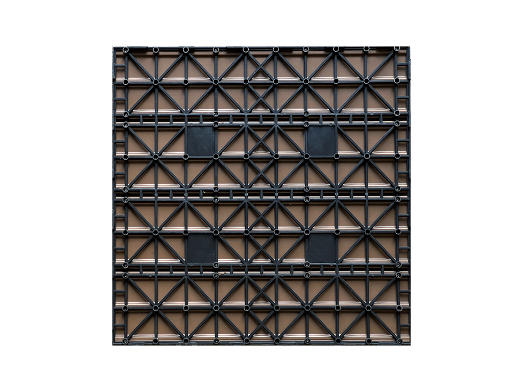 Dank des Klicksystems lässt sich der Boden sehr leicht verlegen und ebenso wieder demontieren. Die Fliesen sind auf einem Trägerrost aus Kunststoff befestigt und werden nur zusammengesteckt.