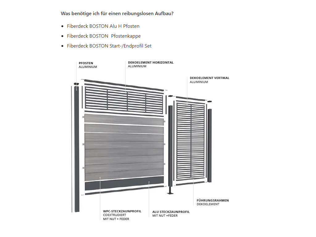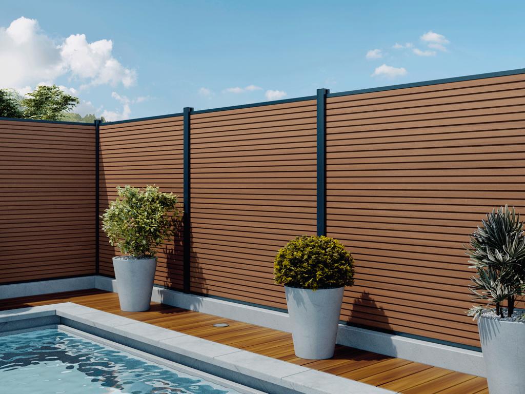 Der WPC Zaun Boston – Kollektion Modern ist ein hochwertiges und langlebiges Sichtschutzzaun-System. Durch den modularen Aufbau kann der Zaun individuell an verschiedene Gegebenheiten und nach Deinen Wünschen gestaltet werden. Die WPC Module mit 15 cm Breite der Serie BOSTON sind perfekt zum Bau von Sichtschutzzäunen geeignet. Die einzelnen Modulbretter werden in die spezielle Aluminiumpfosten der Bosten-Serie eingeschoben und so ein optisch ansprechender Zaun gebaut.