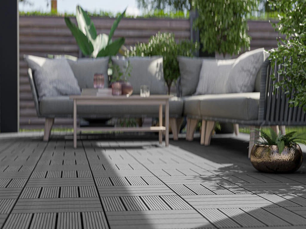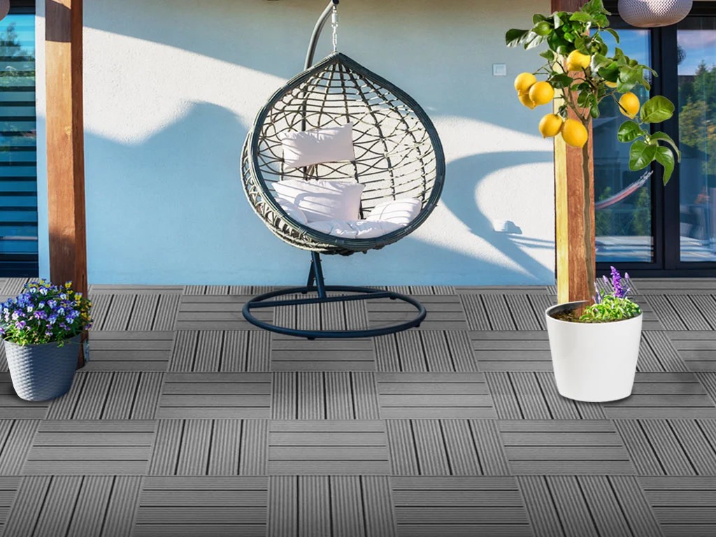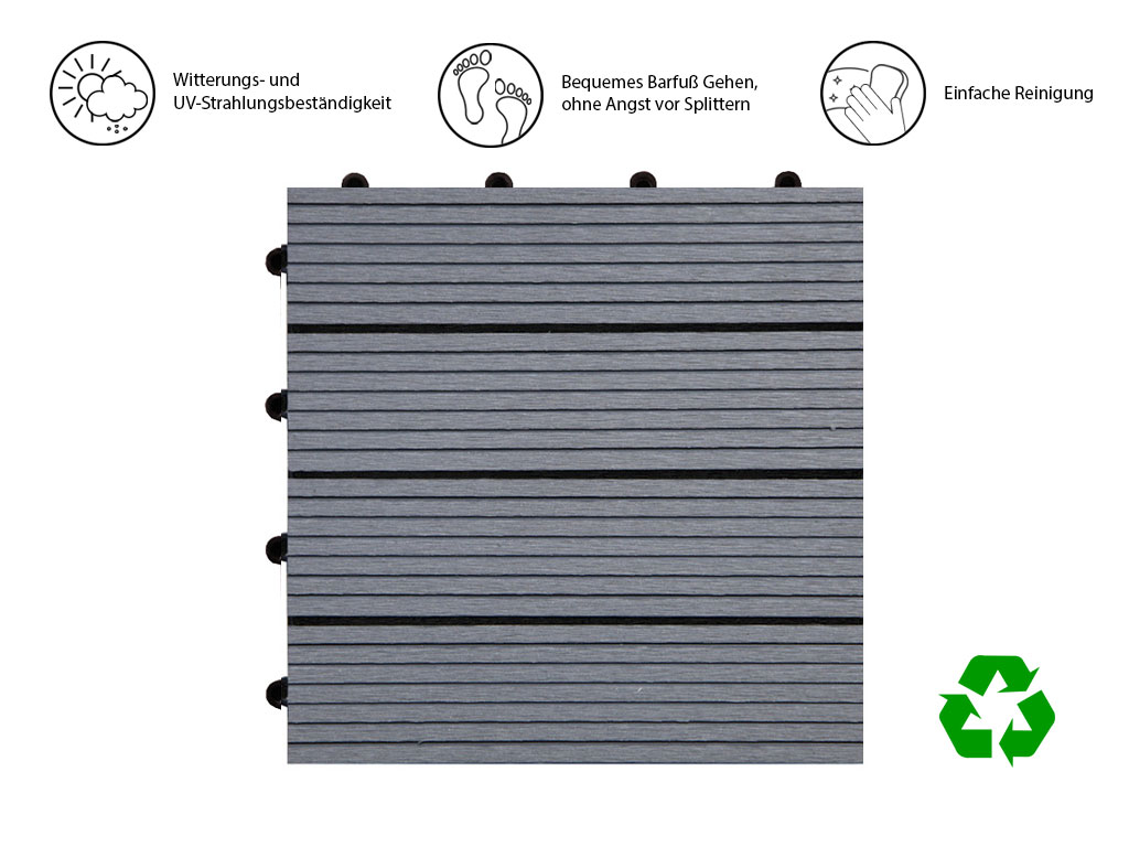 Ideal auch für den Barfußbereich einsetzbar. Die Kombination von Holz und Kunststoff verleiht der Terrasse eine hohe Qualität, sodass du lange Freude an deiner Terrasse hast. Das geriffelte Profil der Terrassenfliese wirkt rutschhemmend und sorgt für ein angenehmes Geherlebnis.